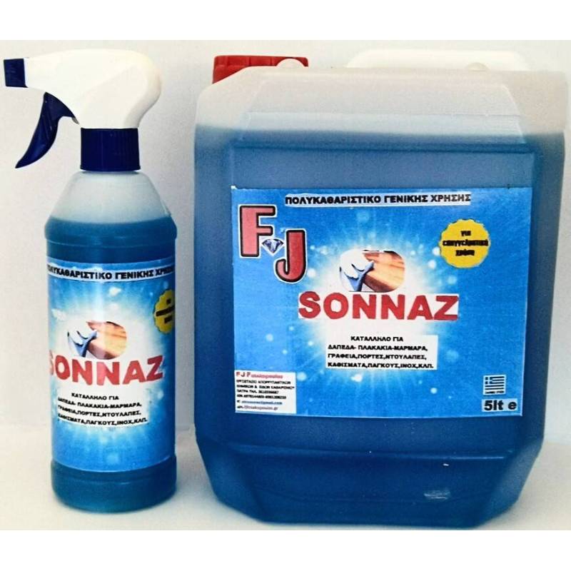 Ενα νεο προιον ΥΠΕΡΚΑΘΑΡΙΣΤΙΚΟ το FJ SONNAZ περιεχει διαλυτες και επιφανειοδραστικα που αφαιρουν το λεκε χωρις να απαιτειται ειδικη προεργασια,δεν περιεχει καυστικες ουσιες που να αλλοιωνουν τα χρωματα,κι εχει υπεροχο αρωμα.Αφαιρει τελεια ολους τους δυσκολους λεκεδες οπως:ανεξιτηλο μαρκαδορο,μελανι,βερνικι νυχιων,διορθωτικο,γρασο,κλπ. απο παγκους,γραφεια,θρανια,τοιχους,πατωματα,πλακακια,τζαμια,ηλεκτρικες συσκευες λευκες και ΙΝΟΧ,καθαριζει επισης φουρνους-γκριλ,καμμενα-κολλημενα γρασα,καταλληλο για προπλυση οχηματων εξωτερικα,κινητηρες,σαλονια,καθισματα,ταπετσαριες,πλυντηρια ρουχων,καθαρισμο χαλιων με μηχανη extraction,για σφουγγαρισμα και παρα πολλα αλλα.